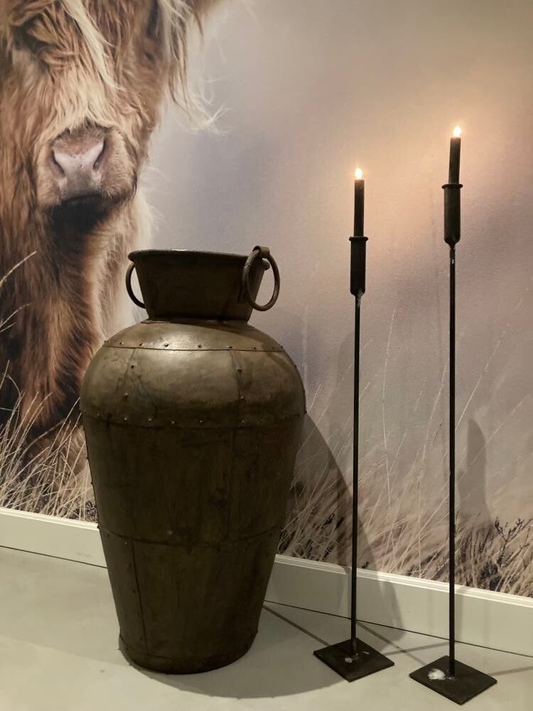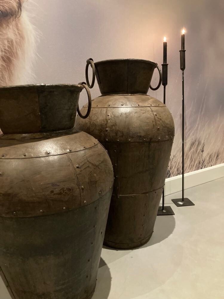 Deze grote jongens zijn gemaakt van metaal en hebben een landelijke uitstraling. Absoluut een blikvanger voor bij je in de woonkamer of hal. Deze vazen zijn met de handgemaakt en zijn niet helemaal egaal. Daarom vind je ook niet twee dezelfde exemplaren. Erg leuk om te decoreren met pluimen, droogbloemen of een krans.