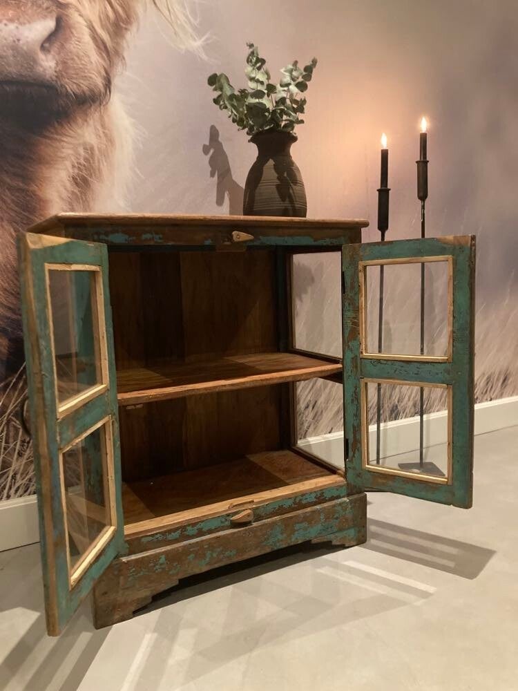 Helaas, je kan niet alles zelf houden. Maar op deze beauty word je toch spontaan verliefd! Deze vitrinekast komt uit India. Wat hem zo leuk maakt, zijn de glazen raampjes aan de voorkant. Met de groene kleur kan je verschillende kanten op. Kies jij voor een landelijke sfeer in huis of toch liever een Ibiza style? Heb jij een mooi plekje voor deze prachtige vitrinekast? Laat het gerust weten!