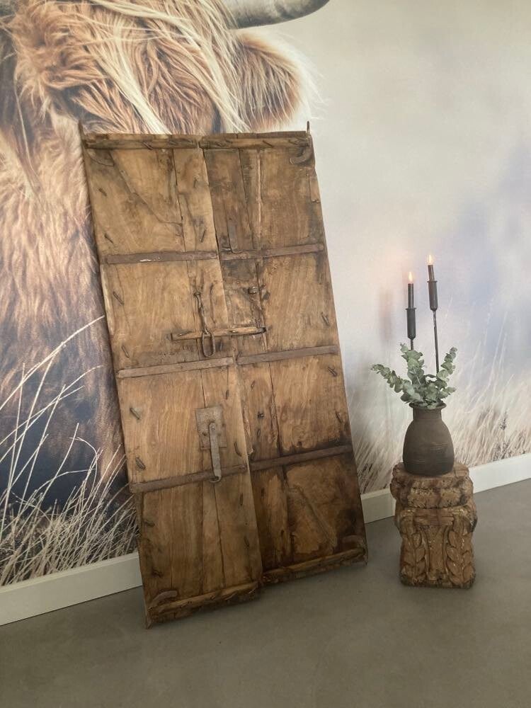 Deze authentieke deuren zijn afkomstig uit India. De deuren zijn van beide kanten erg mooi en daardoor van twee kanten te gebruiken. Deze karakteristieke deuren met metalen beslag en houtbewerking zijn uniek en absoluut een eyecatcher voor in huis of tuin.