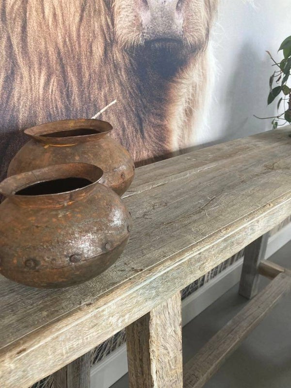 Deze sidetable is afkomstig uit India. Met deze sfeervolle tafel kan je alle kanten mee op. Zet hem bijvoorbeeld achter je bank met leuke accessoires of in de hal. De tafel heeft robuuste poten en is gemaakt van massief hout.