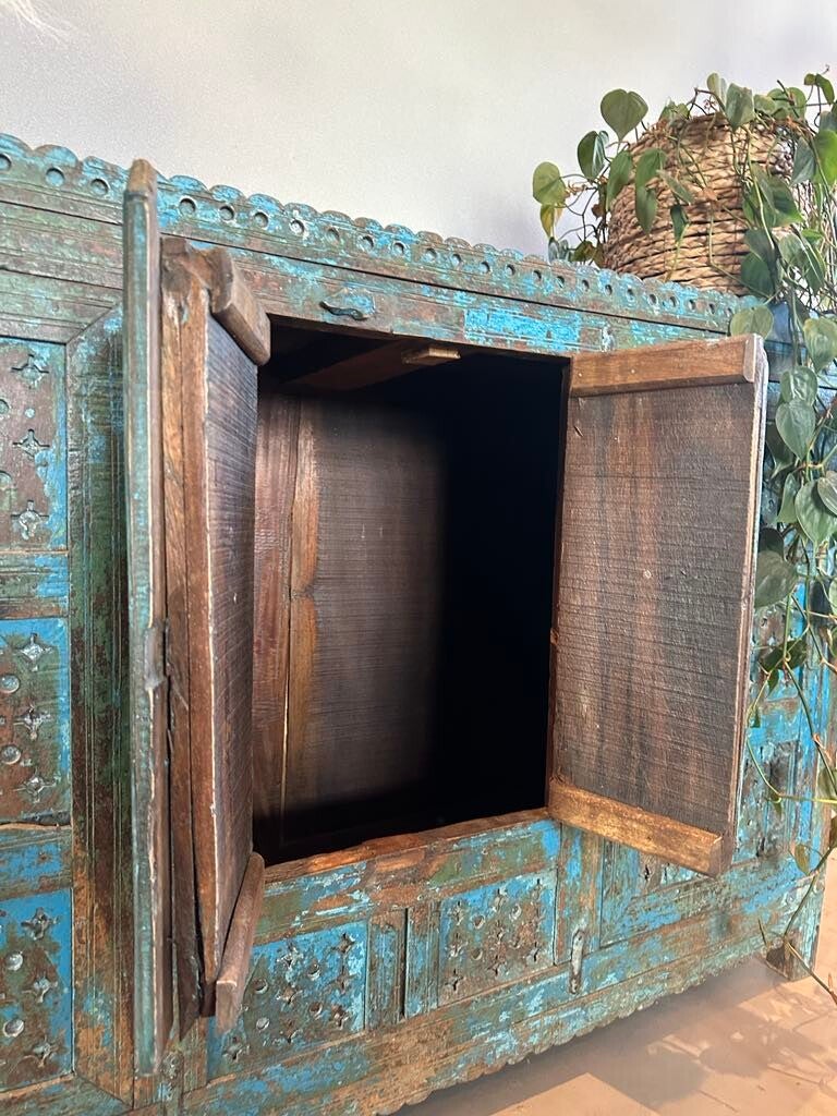 Je zult er absoluut spontaan verliefd op worden! Deze prachtige vitrinekast is afkomstig uit India en heeft een onweerstaanbare charme dankzij de bijzondere afwerkingen aan de voorkant. Of je nu gaat voor een landelijke sfeer in huis of liever een Ibiza-stijl, deze vitrinekast past perfect bij beide opties. Heb je al een ideale plek in gedachten voor dit schitterende meubelstuk? Laat het ons gerust weten!