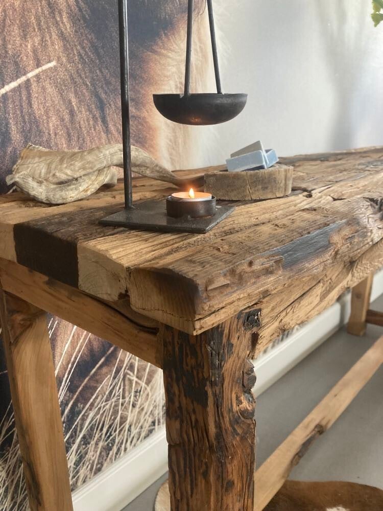 Deze unieke sidetable is vervaardigd uit railway wood, wat zorgt voor een karaktervolle uitstraling. Geen enkele tafel is gelijk door de bijzondere houtnerven en geschiedenis van het materiaal. Een opvallende toevoeging aan elk interieur, met een verhaal dat blijft boeien.