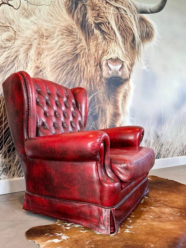 De Chesterfield stoel is een tijdloos meubelstuk met een geleefde uitstraling, doordrenkt met geschiedenis en karakter. Zijn kenmerkende lederen bekleding en knoopdetail geven elke stoel een unieke charme. Maar deze stoel is niet alleen een pronkstuk; hij biedt ook buitengewoon comfort met een diepe zitting en goed gevoerde armleuningen.