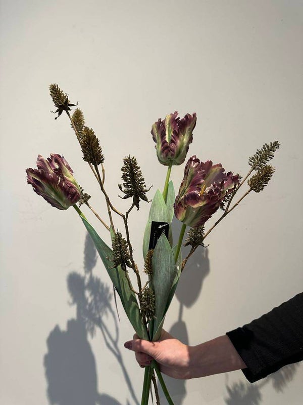 Vrolijk je ruimte op met het Franse Tulp Boeket, een prachtige mix van paarse tulpen. Maak je geen zorgen over verwelking, want dit tijdloze boeket behoudt zijn mooie uitstraling, seizoen na seizoen. En het beste van alles is dat deze paarse tulpen geen water nodig hebben. Voeg een beetje Franse charme toe aan je huis met dit boeket, inclusief een stijlvolle vaas. In onze webshop vind je divers aanbod aan zijden bloemen. Merk: Countryfield.