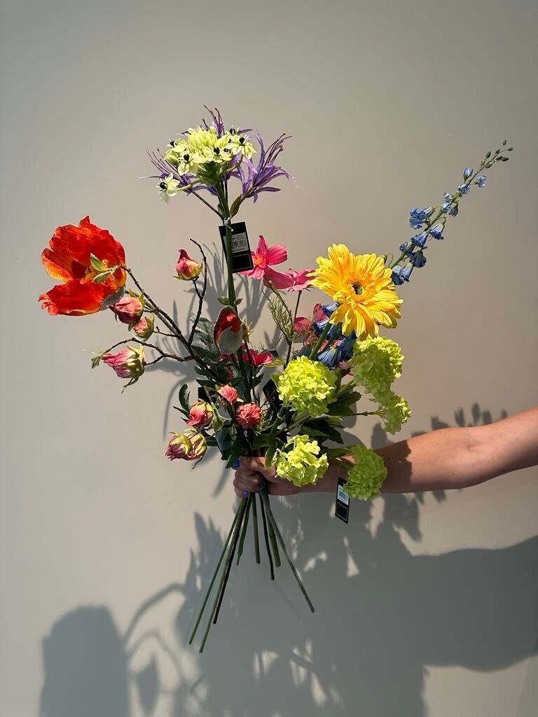 Er zijn 8 soorten zijden bloemen verwerkt in dit boeket.