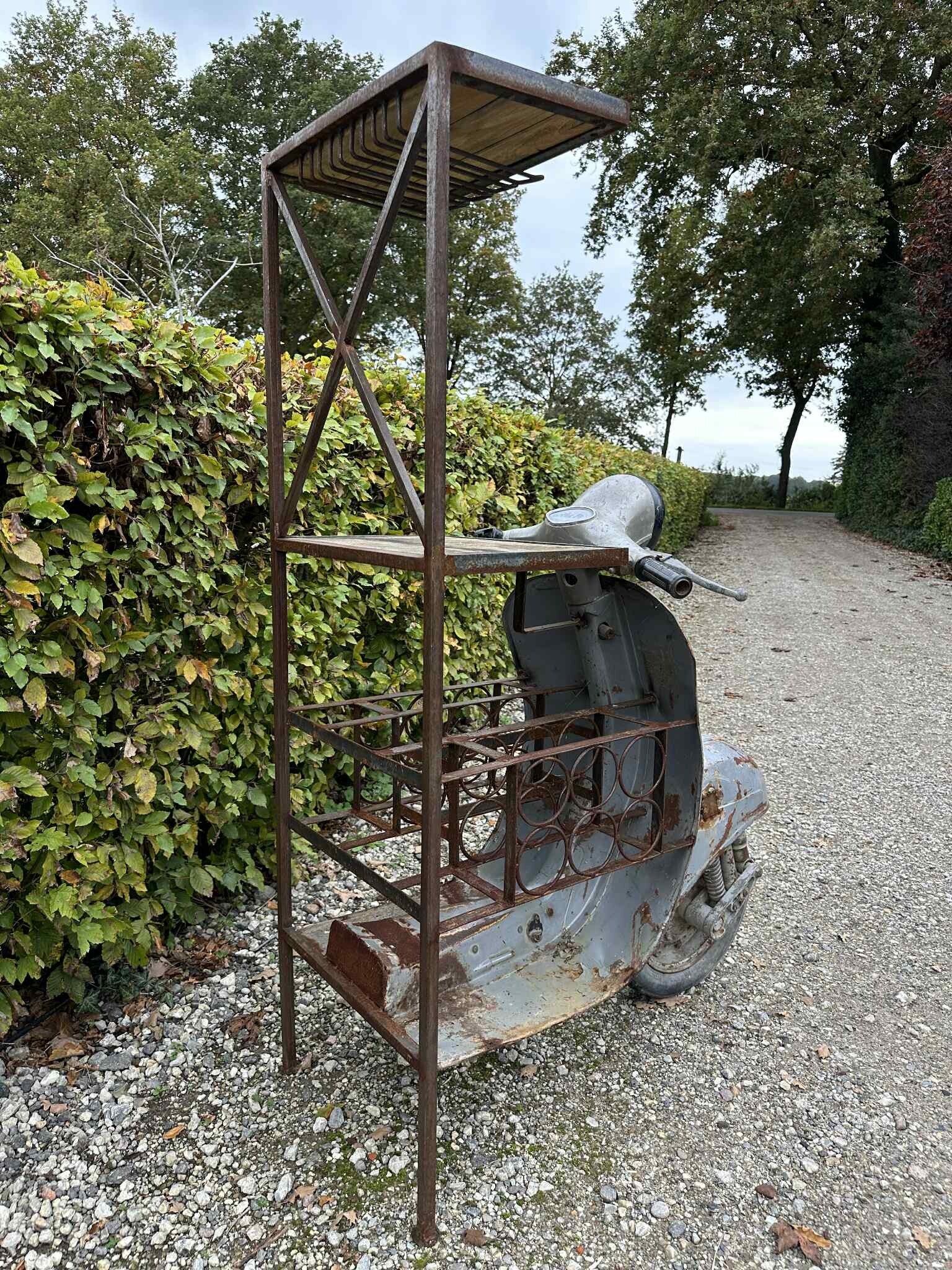 Op zoek naar een origineel item voor je huis, mancave of horecagelegenheid? Dit witte Vespa wijnrek is een echte blikvanger! Hoewel er niet meer op te rijden valt, biedt het stijlvolle rek ruimte voor 6 flessen. Of je nu wijn, frisdrank of andere flessen wilt opbergen, deze retro eyecatcher brengt gegarandeerd flair in elke ruimte. 🍾🛵