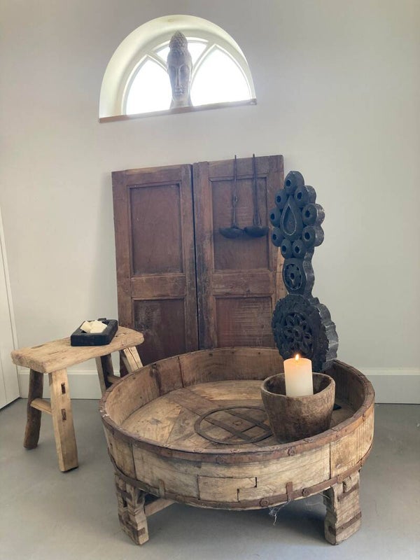Deze prachtige chakki tafel komt uit India. De Chakki's worden in India nog steeds gebruikt. Bijna iedereen op het platteland heeft twee grote maalstenen die ze op elkaar leggen in deze houten maalsteen tafels. Zo malen ze het meel. De tafel kan je gebruiken als salontafel of als bijzettafel. Past goed in een landelijke en sobere interieur.
