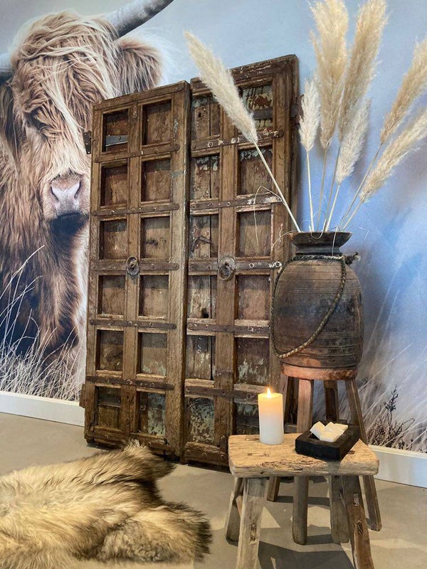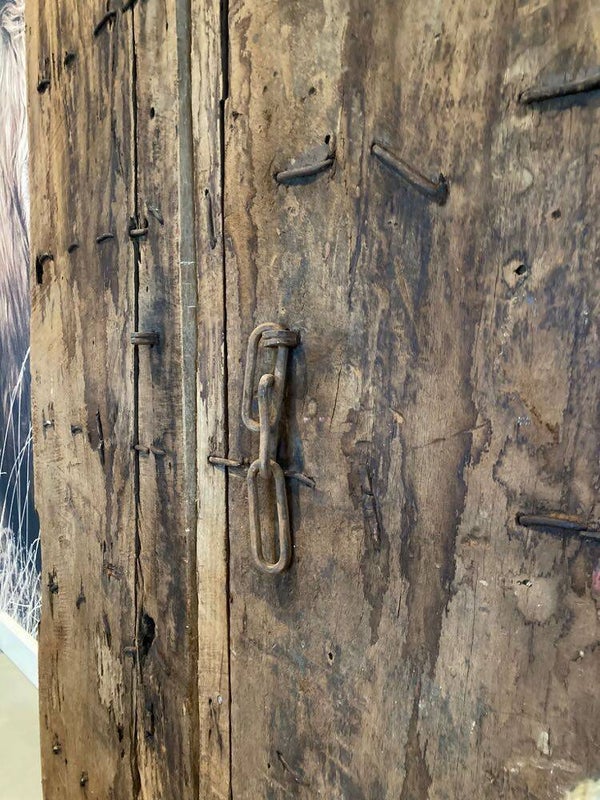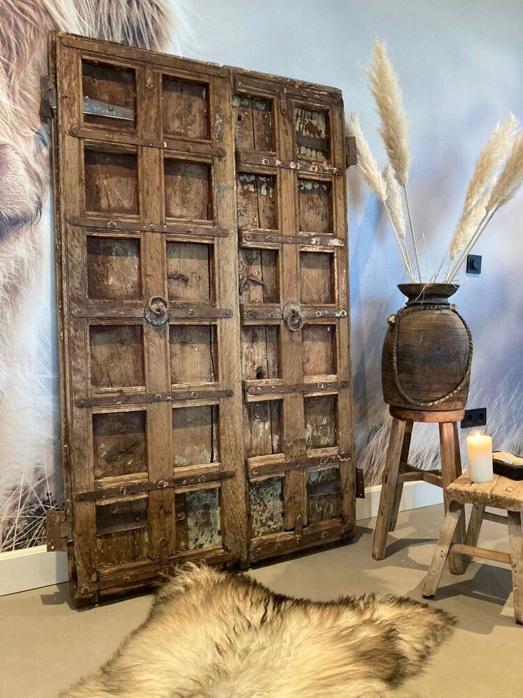 Deze authentieke deuren zijn afkomstig uit India. De deuren zijn van beide kanten erg mooi en daardoor van twee kanten te gebruiken. Deze karakteristieke deuren met metalen beslag en houtbewerking zijn uniek en absoluut een eyecatcher voor in huis of tuin.