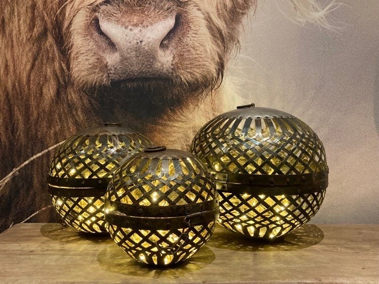 De foto's zeggen al genoeg! Wat zijn deze decobollen gaaf zeg. Ik laat ze zelf ook buiten hangen ;). Deze roestige bollen zijn afkomstig uit India en zijn met de handgemaakt. Daarom kan het wezen dat je geleverde product een beetje afwijkt van de foto. Je kan deze bollen openen en sluiten met een ijzeren pin. Erg leuk met een kaars erin. De bollen worden los verkocht en zijn beschikbaar in 3 maten. Namelijk maat S, M en L.