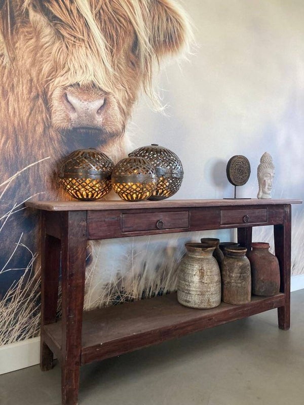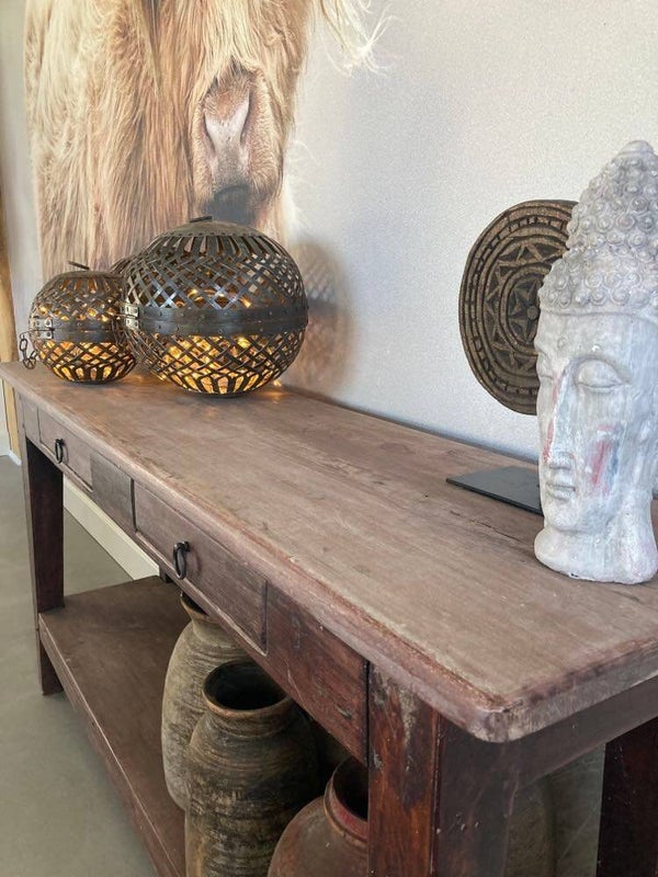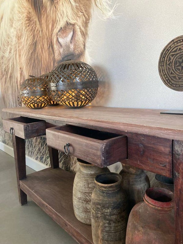 Deze sidetable is gemaakt van oud hout uit India. Met deze sfeervolle tafel kan je alle kanten mee op. Zet hem bijvoorbeeld achter je bank met leuke accessoires of in de hal om je sleutels in op te bergen. De tafel is voorzien van tweede lades, dus je kan er ook nog van alles in kwijt.