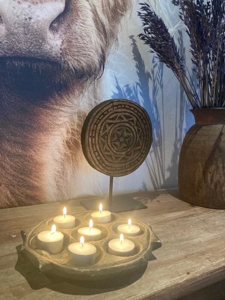 Hou je er ook van om gezellig een kaarsje aan te steken? Dan is dit een leuk item voor jou! Deze waxinelichthouder is gemaakt van spekteen en is afkomstig uit India. Daar werden deze schalen gebruikt om koekjes in te bakken. De schaal werd in zijn geheel in het vuur gelegd. Daarom zijn alle schalen uniek.