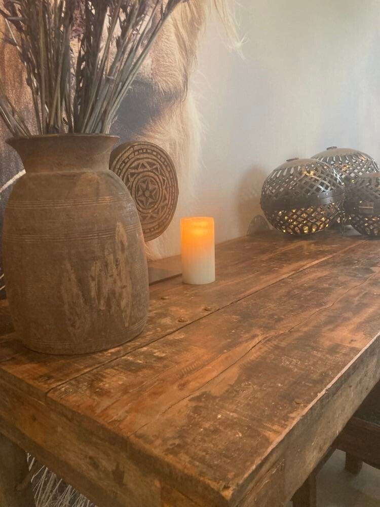 We hebben op dit moment 2 maten beschikbaar. Deze sfeervolle markttafel is afkomstig uit India. De markttafel werd daar gebruikt op markten en bruiloften. Een tafel met geschiedenis en gebruikerssporen. En dat maakt de tafel zo bijzonder. Je zult daarom ook nooit twee dezelfde markttafels vinden. Wij hebben daarom het liefst dat je de tafel zelf komt ophalen. Zo zoek je de tafel uit die bij je past! Deze markttafel geeft een sobere en landelijke sfeer in huis. Op zoek naar een grotere exemplaar? We hebben ook een slag groter in ons assortiment. Tevens hebben wij ook bijpassende legerbankjes te koop.