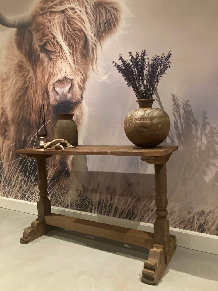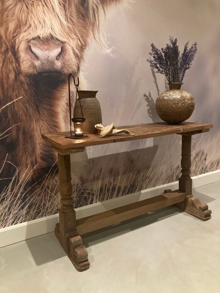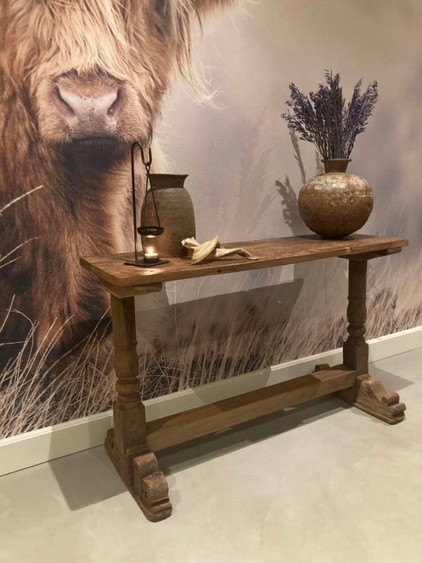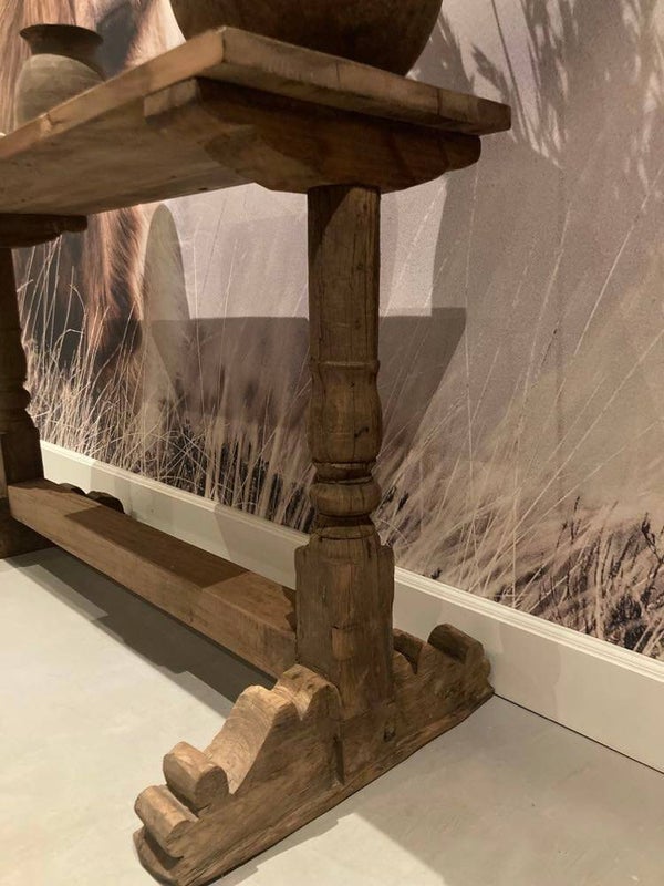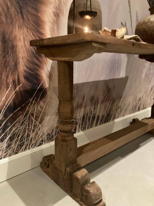 Deze sidetable is afkomstig uit India. Met deze sfeervolle tafel kan je alle kanten mee op. Zet hem bijvoorbeeld achter je bank met leuke accessoires of in de hal. De tafel heeft robuuste kloosterpoten.