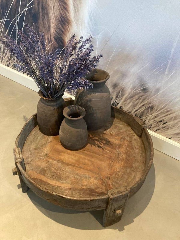 Deze prachtige chakki tafel komt uit India. De Chakki's worden in India nog steeds gebruikt. Bijna iedereen op het platteland heeft twee grote maalstenen die ze op elkaar leggen in deze houten maalsteen tafels. Zo malen ze het meel. De tafel kan je gebruiken als salontafel of als bijzettafel. Past goed in een landelijke en sobere interieur.