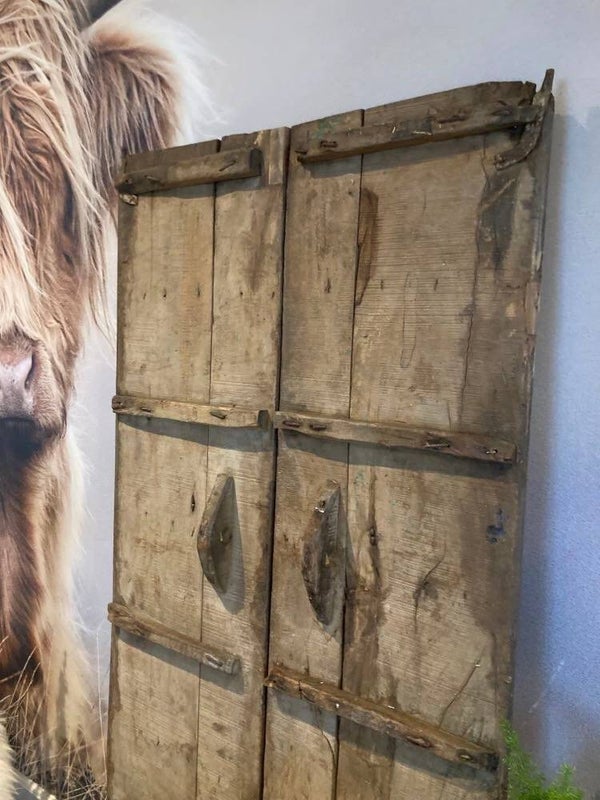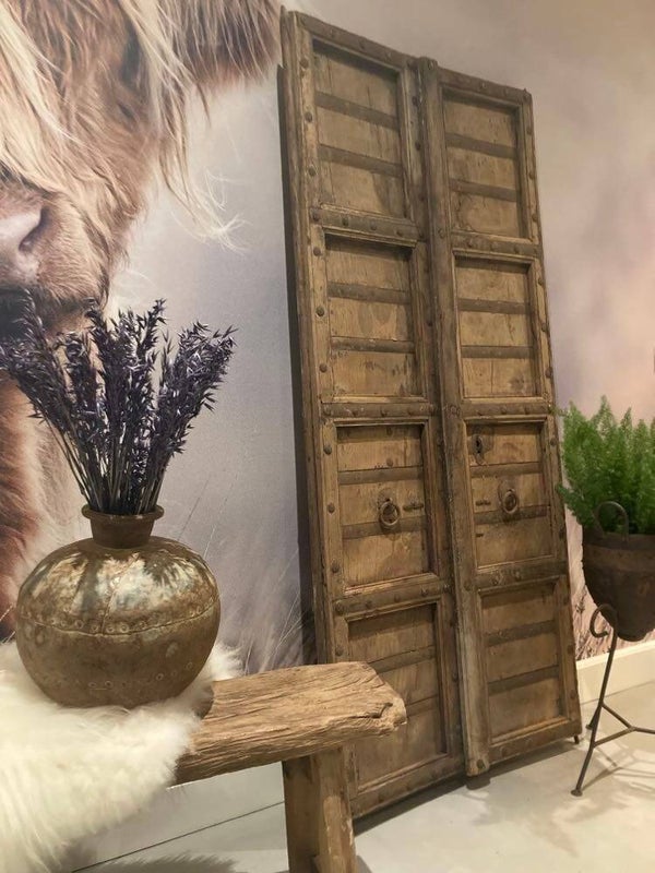 Deze authentieke deuren zijn afkomstig uit India. De deuren zijn van beide kanten erg mooi en daardoor van twee kanten te gebruiken. Deze karakteristieke deuren met metalen beslag en houtbewerking zijn uniek en absoluut een eyecatcher voor in huis of tuin.