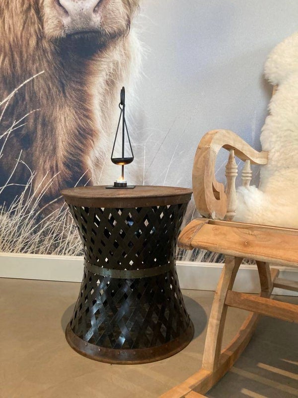 Deze metalen tafel is afkomstig uit India. Het is een stoere meubel die met de hand is gemaakt. Daarom zullen de exemplaren niet allemaal hetzelfde zijn. Erg leuk om te gebruiken als bijzettafel of salontafel.